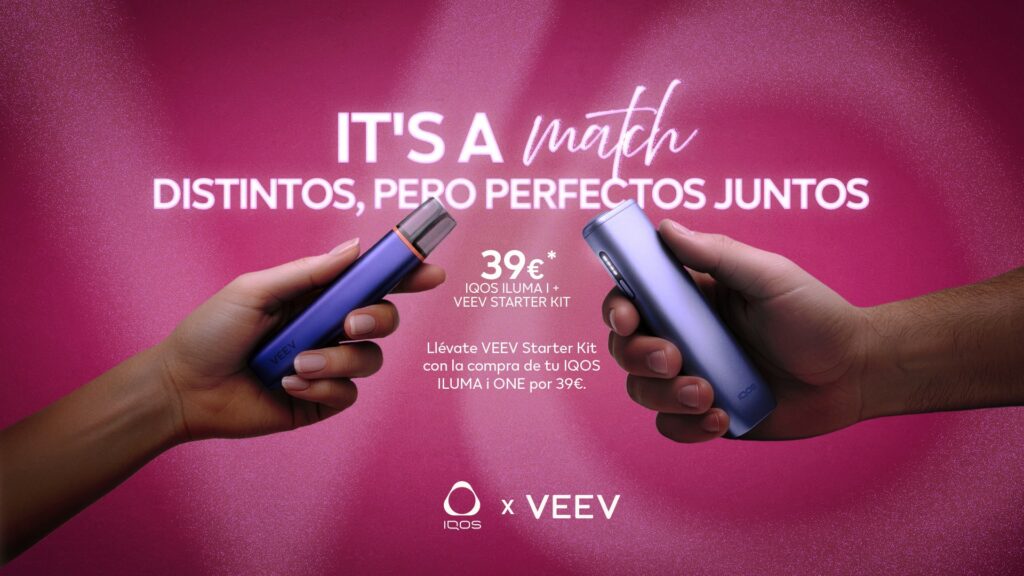 IQOS y VEEV al tratarse de una campaña vinculada a dispositivos de vapeo y tabaco, el proyecto estuvo condicionado por importantes restricciones legales, por lo que su aplicación se limitó exclusivamente al canal estanco y tienda oficial IQOS. La propuesta se desarrolló para soportes impresos y digitales en punto de venta, e incluyó también el diseño de una bolsa promocional para la entrega de los dispositivos.